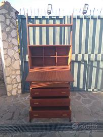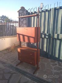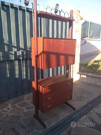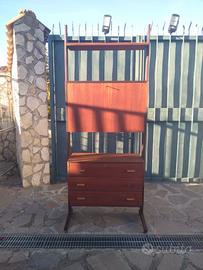 Libreria anni '60 in teak composta da una mensola superiore,un vano contenitore centrale con apertura a ribalta e divisori interni, un vano inferiore a 3 cassetti. Montanti in teak , modanature e piedini in ottone.
