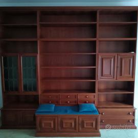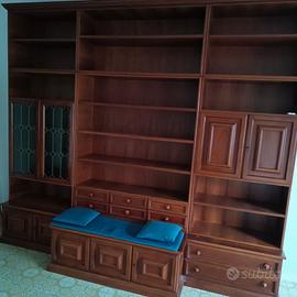 Vendesi, per ristrutturazione appartamento, libreria in massello di noce degli anni '70 larghezza 3 metri con panca annessa alla base e vetrinetta.Il mobile è apprezzato per la sua solidità come era richiesto ai mobili in legno massello di una volta.Solo per veri estimatori.Il trasporto non è compreso nel prezzo ma è a carico dell' acquirente.