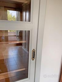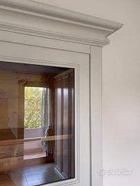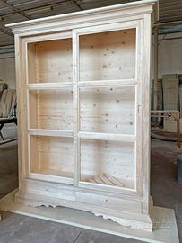 Libreria ante scorrevoli con vetro, tutta in legno massello anche l'interno e lo schienale a doghe. Colore avorio leggermente anticato l'esterno, miele naturale interno. Ripiani sempre in massello con molta tenuta, regolabili in altezza. Nuova mai usata, visibile. L160 x H200 x P43