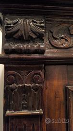 Libreria di antiquariato di valore con decori in legno intagliato e ferro battuto.