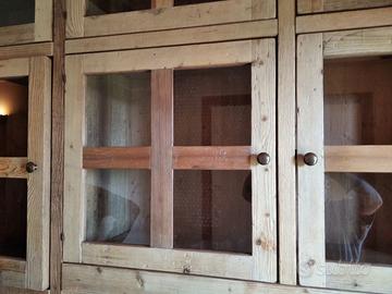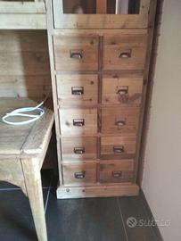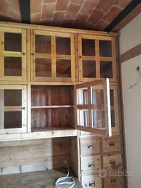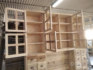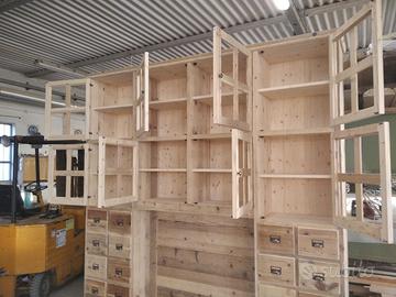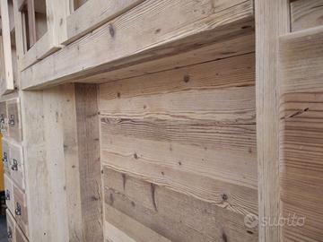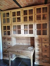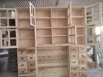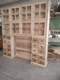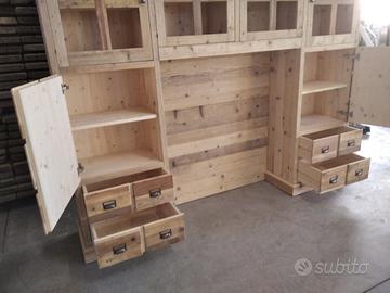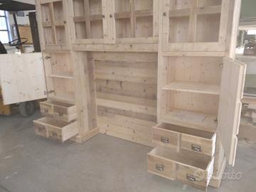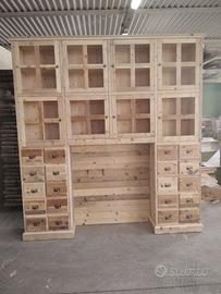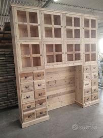 libreria/armadio costruito in legno vecchio recuperato da parancole da muratore ponteggio e case antiche spazzolati trattati e tolte le impurità rendendolo morbido al tatto, a ponte con misure lunghezza 253 profondità 45 (in cornice) altezza 270 in cui internamente sarà in abete nuovo spazzolato mentre esterno in legno vecchio recuperato massello disposto con 2 colonne laterali da 57 in cui troveremo parte sotto 2 cassetti uno sopra altro su sponde in abete massello da 18 e fondo da 14 scoreranno su guide in legno con 2 frontali e 2 manigliette ogni cassetti. sopra 1 anta a dx e 1 a sx su pannello a 3 strati in modo che non si curvi con 6 frontali applicati e relativa maniglietta per apertura su cerniere regolabili ammortizzate da cucina, ripiano interno aggiustabile in altezza. Parte superiore con 8 vani in cui troveremo anta unica con telaio e crociera tutto in legno vecchio e pomello per apertura con vetro trasparente da 4 mm (ante in luce si vedrà lo spessore del montante) su cerniere in stile parte interna con ripiano aggiustabile in altezza della crociera. Piedini livellatori per mettere a bolla il tutto. Smontabile, unione di tutto armadio è effettuato tramite perni e bussole e spine in legno. schienale autoportante da 40 mm in legno vecchio parte a giorno sotto al ponte mentre nel restante da 14 mm in abete nuovo. Travetto in legno che congiunge le 2 colonne x rinforzo al ponte centrale. Finitura cerato neutro su legno vecchio e dove necessita noce su abete nuovo. compreso di finitura imballo franco fabbrica non comprendente di iva. mobile è già stato prodotto su specifiche del cliente su commissione di conseguenza non è in pronta consegna e non teniamo a magazzino ma essendo i diretti produttori costruiamo solo su misura in base alle proprie esigenze, per dubbi e chiarimenti contattateci. direttamente dal produttore falegname costruiamo su misura a piacere del cliente. ASTENERSI RIVENDITORI E COMMERCIANTI