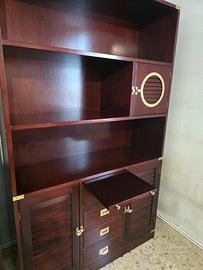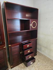 Libreria artigianale in stile marina, realizzata in mogano e con accessori in ottone, ante a persiana, cassetti e un'anta scorrevole con oblò. Missura: 115 x 190 x 38
