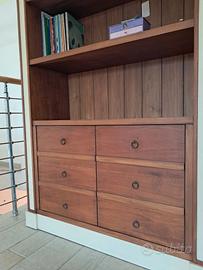 Libreria artigianale in legno, parte inferiore chiusa con tre cassetti e due vani chiusi con ante. Parte superiore a giorno con nove mensole.