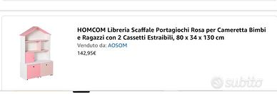 Vendo libreria/porta-giochi per bambini a forma di casetta, colore rosa e bianco.
