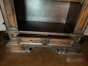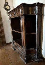 Elegante mobile libreria a giorno in legno pregiato, caratterizzato da un design architettonico di grande impatto. Ideale per studi, salotti raffinati o come mobile da ingresso. Il mobile si distingue per la sua struttura solida e per i dettagli costruttivi: Design a giorno: Ampio vano centrale con ripiani e scaffalature laterali a vista con profilo sagomato. Vani Segreti: La fascia superiore e quella inferiore nascondono degli scomparti a scomparsa (camuffati da cassetti con pomelli in ottone), perfetti per custodire documenti o oggetti preziosi. Dettagli: Colonne laterali a sezione quadrata, modanature classiche e base a zoccolo lavorata. Materiale: Legno massello con finitura color noce scuro. Condizioni: Il mobile è strutturalmente integro e solido. Presenta i normali segni del tempo e dell'usura (piccoli graffi superficiali visibili in foto) che ne attestano l'autenticità e il fascino vintage. Una leggera passata di cera lo riporterebbe al suo massimo splendore. Misure: (Larghezza 107 x Altezza 103 x Profondità 32 cm)