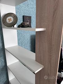 Libreria bianca con pannello effetto legno