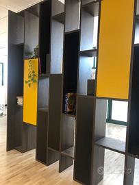 Importante libreria in legno bifacciale con ripiani aperti, ideale per separare ambienti open space.