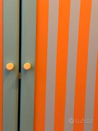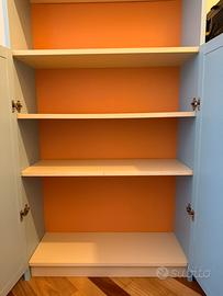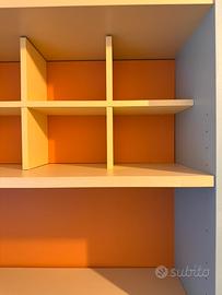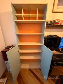 Libreria ikea billy con accessori ( ante e divisorio per mensole ) riverniciata con colori Novevento Paint: Azzurro cenere, uovo di pettirosso, rosso tramonto, lino.