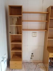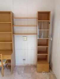 Libreria scomponibile con ripiani, scrivania e sedia. Le due colonne laterali e gli scaffali singoli sono separabili rispetto al corpo centrale. Misure larghezza 350 cm, altezza 220 cm, profondità 30 cm