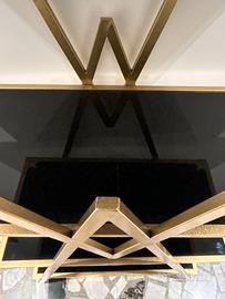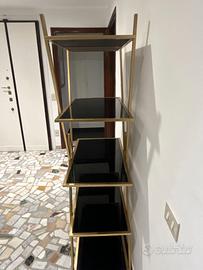 Libreria Scaffale classico ed elegante 5 Ripiani rettangolari porta libri/oggetti realizzati in vetro nero Solida struttura in ferro verniciato oro, con lavorazione centrale, forma a clessidra
