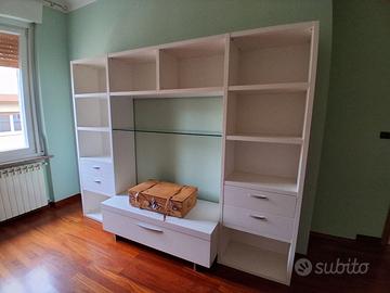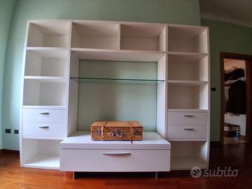 LIbreria bianca, molto capiente, in ottime condizioni. Misure: altezza cm 210, larghezza cm 270 (oppure cm 340 con suo armadio chiuso da porta vetro satinato attualmente smontata), profondità cm 38. Cassettoni a incastro misure: altezza cm 45, larghezza cm 135, profondità cm 60. Completa di pannello posteriore.