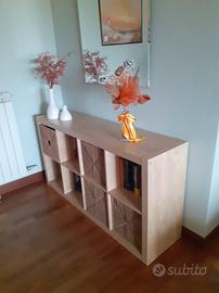 libreria completa di contenitori, di lunghezza 150 cm, altezza 78, profondità 39, color faggio ben tenuta
