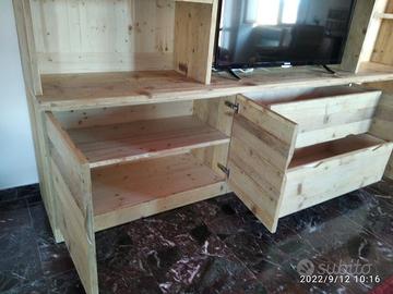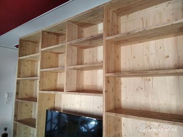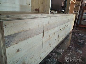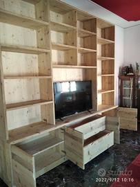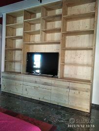 libreria costruita in ABETE VECCHIO recuperato da solai e parancole levigato spazzolato in modo che sia morbido al tatto con misura libreria lungh.300 prof.50 la base e 40 alzata superiore h totale 280. predisposto parte sotto con zoccolo h 10 in pattina di legno vecchio e internamente troveremo piedini livellatori per mettere a bolla il tutto disposta appena sopra con vano da 100 cm di lunghezza per altezza circa 70 in cui nel primo e ultimo troveremo 2 + 2 ante costruite a 3 strati in modo che non si incurvino nel tempo interno multistrato di pioppo esterno cartelle da 6 mm ambo i lati di abete vecchio, si apriranno su cerniere da cucina regolabili ammortizzate in chiusura e internamente troveremo ripiano in abete nuovo aggiustabile in altezza con ferramenta idonea, apertura con maniglia a triangolo gola. Nel vano centrale troveremo 2 cassetti posti uno sopra altro su guide ammortizzate in chiusura interno cassetto in betulla con frontale a 3 strati in legno vecchio con apertura triangolo. Parte superiore con profondità 40 cm predisposta 4 vani a giorno tra piccoli e grandi (a 3 strati come i ripiani con spessore circa 3 cm) con 12 ripiani aggiustabili. Parte centrale spazio libero per la tv con altezza circa 90 con schienale posteriore portante restante schienale più fine da 14 mm con fascia alle estremità in modo che dia robustezza al tutto spazzolato. Finitura cerata neutra su legno vecchio, su abete nuovo cerata scura. è stato costruito su commissione ed esigenze del cliente, non è disponibile a magazzino ma essendo i diretti produttori falegnami possiamo riprodurlo uguale o in base alle proprie esigenze. per domande o dubbi contattateci P.S. disponibili a dare suggerimenti o chiarimenti in merito, per noi conta dare vita al vostro sogno DIRETTAMENTE DAL PRODUTTORE ASTENERSI RIVENDITORI O COMMERCIANTI