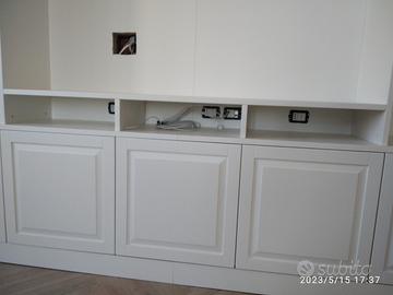 libreria costruita in listellare ricoperto di mdf (idoneo per essere laccato uniformemente) spessori 25 19 mm e schienale da 8 mm. misure lunghezza 500 x h 240 prof. 50 in cornice con zoccolo h 10 cm, suddivisa in 5 moduli ai 2 lati esterni modulo da 53+53 (2 ante 1 sopra e 1 sotto costruite con telaio in massello di toulipier e pannello inserito posteriormente diamantato apertura push pull a pressione 4+4 ripiani per vano totale 8 aggiustabili con ferramenta idonea. Rientrando 2 vani da 110 circa predisposti con sotto 2+2 ante costruite su telaio cerniere regolabili pistoncino premi apri, interno 1 ripiano per vano aggiustabile. Sopra troveremo nei vani a giorno 3 + 3 ripiani aggiustabili in altezza spessore 2,5 cm con bussola e staffa a coda di rondine. Modulo centrale da circa 180 cm disposto con 3 ante sotto telaio e pannello interno bugnato su cerniere con h circa 75 cm, appena sopra troveremo ripiano fisso con 2 supporti centrale di divisione per inserire dvd o altro, parte superiore a giorno per poter posizionare tv (spazio utile da 180 x 135 schienale portante da 19 mm con applicazione di ferramenta idonea rientrante posteriormente autoportante in modo da dare robustezza e stabilità con passaggio cavi posteriori) nel vano centrale tv parte superiore a giorno di cui 1 fisso appena sopra lo schienale fisso. cappello superiore da 19 mm, cornice e fasce laterali dx e sx di chiusura con piedini livellatori per mettere a bolla il tutto, smontabile con ferramenta idonea perni in ferro spine in legno con grani e barilotti. Finitura laccato bianco opaco rall 9010 su tutta la libreria. costruito su commissione ed esigenze del cliente. franco fabbrica iva da calcolare a parte. già stato prodotto e venduto su commissione non teniamo magazzino ma essendo i diretti produttori possiamo costruirlo come uno lo desidera in base alle proprie esigenze. trattate direttamente con il produttore per dubbi e chiarimenti contattateci. ASTENERSI RIVENDITORI E COMMERCIANTI