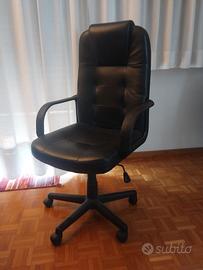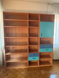 Libreria colore ciliegio/blu /azzurro Lung. 205, Larg. 36, H. 228 con piano penisola fagiolo destro 150x90x78 da montare facoltativamente e poltrona da ufficio nera altezza regolabile.