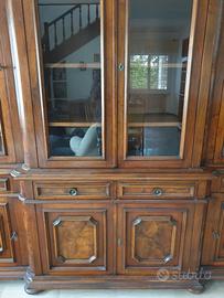 Vintage libreria con vetrina, cassetti e ante, composta da due parti e realizzata a mano con finitura in legno di noce.