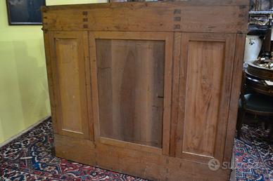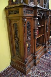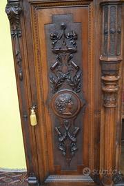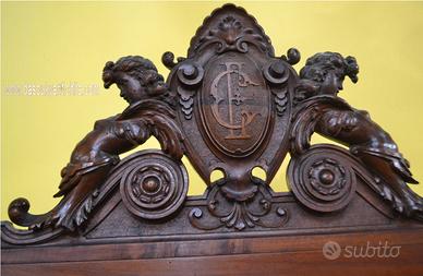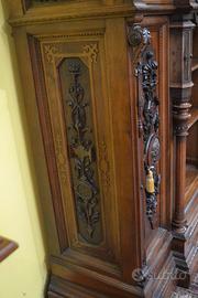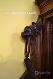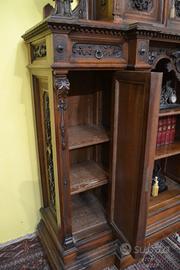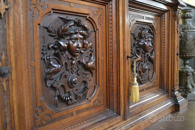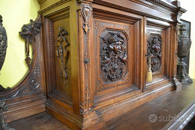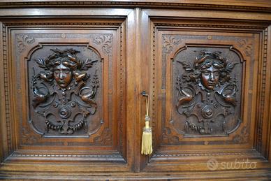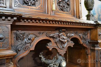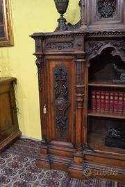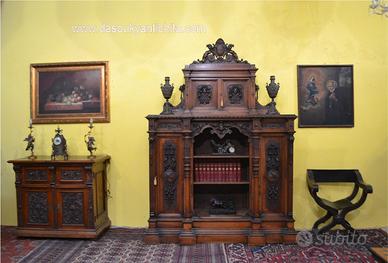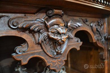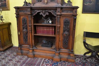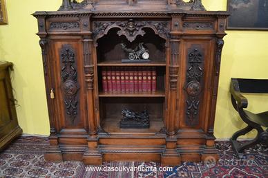 Imponente libreria -credenza del XX secolo stile Neorinascimentale, realizzata in pregiato legno di noce massello scolpita con grande maestria. La parte superiore è dominata da un maestosa cimasa, riccamente intagliata con motivi a volute fogliacee che culminano in uno stemma centrale. Al di sotto, un corpo a due antine troviamo incorniciate dei volti scolpiti ad altorilievo immersi in un trionfo di trame vegetali, che ne esaltano a profondità. La parte focale di questo mobile è il vano a giorno , ideale per l’esposizione di volumi o oggetti d’arte, incorniciato da un arco mistilineo, dove al centro spicca un volto grottesco che funge da elemento chiave. Ai lati, due ampi montanti sono decorati con lesene a colonna e due sportelli con ripiani all’interno , finemente intagliati con medaglioni centrali raffiguranti un busto femminile di profilo , ispirato all’estetica dei cammei , che si collegano alle decorazioni sopra e sotto con foglie, nastri e piccoli rami che sembrano arrampicarsi. Il fianco del mobile non è una semplice chiusura, ma il naturale proseguimento del racconto artistico., dove all’interno di eleganti cornici modanate, spiccano pendenti vegetali intagliati con estrema finezza, trasformandolo in un’architettura scultorea continua che ne celebra l’assoluto prestigio e l’unicità STATO : Il mobile è stato recentemente sottoposto a un ciclo di trattamento antitarlo . La presenza di alcuni piccoli fori sulla superficie è da considerarsi una “patina del tempo” assolutamente naturale dovuto all’epoca. Per esaltare appieno la bellezza delle venature del noce e la profondità degli intagli, verrà sottoposto a una lucidatura finae a mano poco prima della consegna. DIMENSIONI: LARGHEZZA 187 CM. PROFONDITA’ 55 CM. ALTEZZA 251 CM. Chi fosse interessato a una visita virtuale della nostra galleria può accedere ai motori di ricerca, inserendo il nominativo " Dasouky antichita' " Per informazioni contattateci ai seguenti numeri Cell. - Cell.