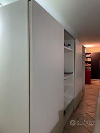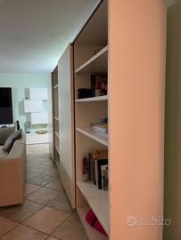 Libreria - Credenza FEG Design con 2 ante scorrevoli con possibilità di posizionarle centralmente, lateralmente o sfalsate, lunghezza 390 cm, altezza 198 cm, profondità 43 cm. Solo ritiro.