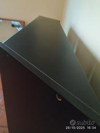 libreria nera, asimmetrica, ideale anche per dividere ambiente,aperta da ambo le parti. Altezza 1,10 x 1,15 ,profondità 24 cm.