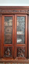 Libreria d'epoca in legno lavorato con intarsi e raffigurazioni, con sportelli in vetro opaco e rifiniture in ferro battuto.