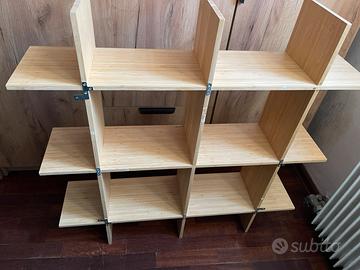 Vendesi elegante libreria in legno di bambù (o finitura effetto legno naturale), caratterizzata da un design a incastro moderno e versatile. Grazie alla sua struttura asimmetrica, non è solo un pratico contenitore, ma un vero e proprio elemento d'arredo che dona movimento a qualsiasi stanza. Ha solo 3 ganci per appenderla