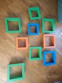 Vendo libreria da parete; due cubi blu, due cubi arancioni e 5 cubi verdi in legno.