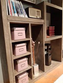 Libreria da soggiorno artigianale in legno trattata con resina impermeabile, verniciata e smaltata con malta per legno.