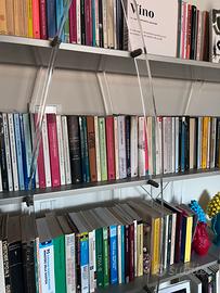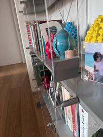 Libreria di design, mensole molto solide, frontalmente ha delle aste in plexliglas curve molto solide.
