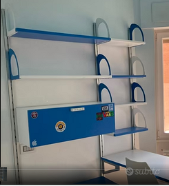 Libreria a mensole con profilati di alluminio h. 230 cm, mensole e portaoggetti larghezza 90 cm, altre mensole larghezza 45 cm. Scrivania con piede larghezza 132 X53 cm di profondità. Marca Colombini tutto in ottimo stato e usato pochissimo. Non sono comprese sedie e cassettiera.