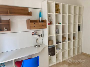 Libreria e scrivania con pannello. La libreria è separata dalla scrivania, per cui i due elementi possono essere apposti su pareti diverse. La libreria puo anche essere posizionata al centro di una stanza per separare gli ambienti. Vendibili anche separatamente. Entrambe acquistate dal mobiliere, qualità ottima. Ritiro e smontaggio a carico dell’acquirente.