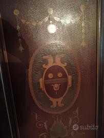 libreria e scrivania (con una poltrona e due sedie) in legno con disegni. mobile e scrivania e due sedie perfetti mentre la poltrona presenta qualche segno di usura. Ve sibili anche singolarmente. ritiro presso il domicilio. dimensioni libreria 235, altezza 200 profondità 61. scrivania 84x169 altezza 79.