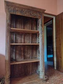bellissima libreria etnica realizzata artigianalmente . il mobile è in legno ed ha decorazioni laterali in ghisa.