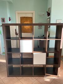 Libreria Expedit (ora Kallax) 4x4 effetto noce con due contenitori ad anta bianchi. Praticamente come nuova. Già smontata e pronta da trasportare. Questo colore non è più in produzione. No spedizione, solo ritiro a mano.