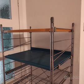 Come nuova: libreria design Frezza, con 6 ripiani di vario tipo: 2 in metallo forato blu, 3 in metallo a rete, 1 in legno chiaro. Altezza 150 Larghezza 64 Profondità 45
