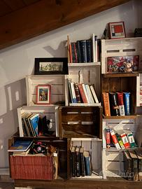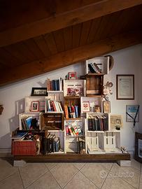 Libreria costruita a mano con cassette della frutta pulite e dipinte a mano. Misure: altezza massima 180 cm, larghezza massima 180 cm. Libri e altri oggetti della foto non sono inclusi.