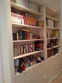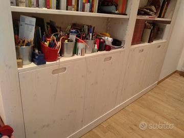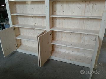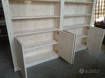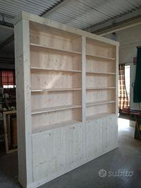Libreria in abete massello con lunghezza 250 cm altezza 267 cm profondità 35 cm. Completa di schienale posteriore costruito con fascia perimetrale per dare robustezza al tutto da 14 mm avvitato posteriormente. La libreria è costruita interamente in abete massello e completamente smontabile e facile da montare con fianchi da 20 mm e applicato frontalmente spalletta dritta liscia e ripiani tutto da spessore 2,4 cm con legno duro inserito alle estremità, saranno aggiustabili con scaletta, restante con barilotto con perno e spine in legno. Completo di gambette livellatrici nascoste dietro allo zoccolo in maniera da mettere a bolla il tutto. 2 vani da circa 125 cadauno predisposto per 4 ripiani parte a giorno superiore mentre 1 interno delle ante parte bassa. le 4 ante con venature verticali con pannello a 3 strati in modo che non si incurvi nel tempo su cerniere da cucina ammortizzate che si apriranno su fresata in legno. Tutto carteggiato e spigolato in modo che sia morbido al tatto. Completo di finitura a 2 componenti sbiancata su tutta la libreria. essendo i diretti produttori falegnami costruiamo su misura e su specifiche del cliente, il prezzo comprendente mobile finitura e imballo franco fabbrica, iva da calcolare a parte non essendo compreso. il mobile è stato già prodotto su specifica del cliente e possiamo riprodurlo uguale o su proprie specifiche dato che siamo i diretti produttori, niente intermediari. forniamo anche trasporto e montaggio a parte da calcolare per dubbi ci contattateci. ASTENERSI RIVENDITORI E COMMERCIANTI