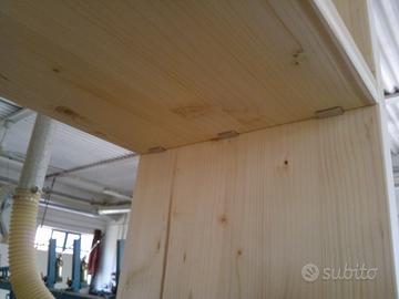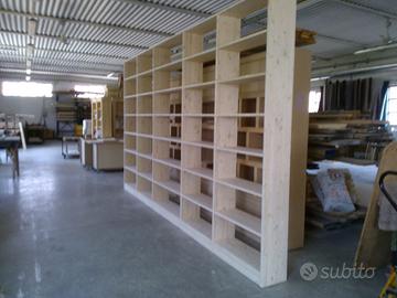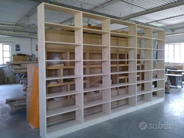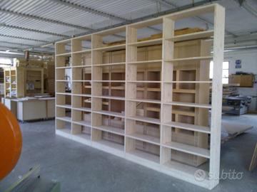 La libreria costruita interamente in abete massello lungh.480 h 270 prof 30 completamente smontabile con fianchi spessore 3 cm e ripiani spessore 2,4 cm. costruiti 4 vani di circa 90 cm in lunghezza e 1 centrale da 120 cm e in ogni modulo ci sono 6 ripiani cadauno aggiustabile in altezza in 3 posizioni e supportati da ferramenta che verrà avvitata nel legno (coda di rondine maschio nel fianco e femmina nel ripiano). Senza schienale (ma lo consigliamo in quanto per la stabilità e per la pulizia con piedini livellatori per mettere a bolla il tutto nascosti dietro lo zoccolo con tappini di chiusura. unito il tutto con ferramenta idonee spine in legno barilotti con grano in ferro. compreso imballo franco fabbrica non comprendente di iva e finitura. mobile è già stato prodotto su specifiche del cliente su commissione di conseguenza non è in pronta consegna e non teniamo a magazzino ma essendo i diretti produttori costruiamo solo su misura in base alle proprie esigenze, per dubbi e chiarimenti contattateci. direttamente dal produttore falegname costruiamo su misura a piacere del cliente. ASTENERSI RIVENDITORI E COMMERCIANTI