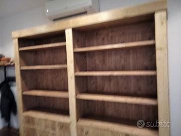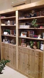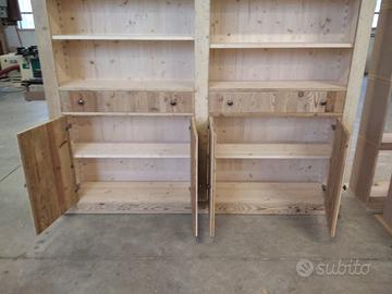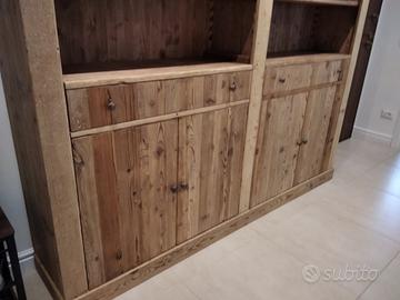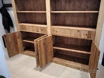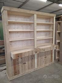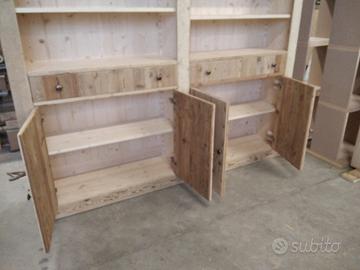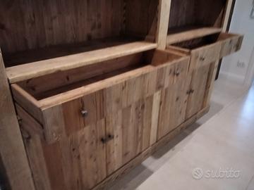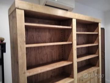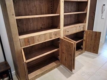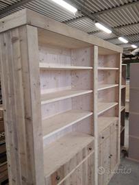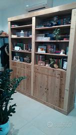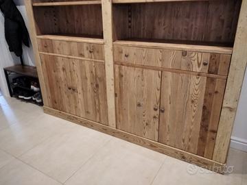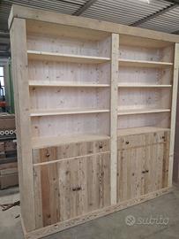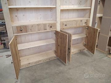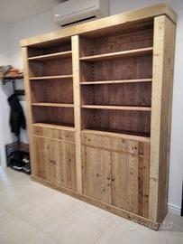 libreria in legno di abete vecchio recuperato e spazzolato da assi da muratore parancole vecchie con misure lungh. 220 (misure in cornice esterna) prof.41 h 230. Composto in 2 moduli uguali da circa 110 cm cadauno predisposti con parte superiore con 3 +3 ripiani aggiustabili in altezza con cremagliera in legno, spessore 2,4 cm in abete nuovo in cui verrà inserito alle teste legno duro perché non si incurvino nel tempo, spalletta frontale in pattina originale. appena sotto parte centrale circa troveremo 2 cassetti che scorreranno su guide in legno con sponde da 18 mm e fondo da 14 mm con pomello per apertura dritti lisci, termina parte sotto con 2+2 ante in cui saranno dritte lisce lineari con venatura verticale a 3 strati in cui parte interna multistrato mentre parte esterna cartelle in legno vecchio ambo i lati in modo da avere la bilanciatura perfetta e non si muovano nel tempo. si apriranno su cerniere da cucina ammortizzate in chiusura regolabili. zoccolo h 10 cm dritto lineare in pattina con piedini livellatori per mettere a bolla il tutto, perni in ferro con relativo barilotto e grano e spine in legno. schienale in abete da 14 mm con fascia all'estremità per dare robustezza al tutto. Finitura cerato neutro su abete vecchio noce scuro su abete nuovo. il prezzo NON COMPRENDENTE DI IVA. libreria è già stata prodotta su commissione Non teniamo magazzino ma essendo i diretti produttori possiamo costruirla uguale o su specifiche essendo i diretti produttori. ASTENERSI RIVENDITORI E COMMERCIANTI.