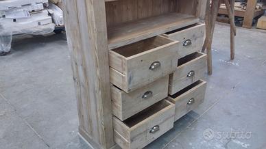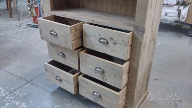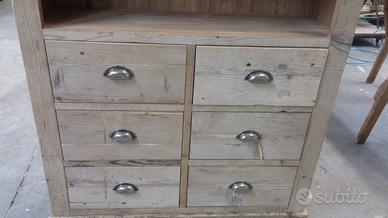 Libreria con 6 cassetti e ripiani aggiustabili con misure lungh.100 prof.35 h200 costruita interamente con legno di assi vecchie intendesi con assi di vecchi solai di case rurali antiche, tutto al naturale come lo si vede in foto, schienale e parti interne del cassetto in abete nuovo tintato, il suo pregio del legno vecchio è che lo si vede grezzo ma essendo ben levigato risulta morbido al tatto. possibilità di farla con varie lunghezze e profondità cassetti singoli dubbi o tripli ecc... Dato che noi siamo i diretti costruttori li facciamo noi con le nostre mani siamo in grado di soddisfare qualsiasi richiesta che può essere su misura del cliente sia cassettiera librerie o altro sia legno vecchio sia altro legno. completo di 3 ripiani aggiustabili tramite cremagliera in abete con incastro lateralmente con legno duro inserito in modo che non si incurvi nel tempo. il prezzo si intende franco fabbrica grezzo da falegnameria compreso di imballo e maniglie antiche con finestrella come le vecchie pastaie di una volta; mobile già realizzato su commissione di conseguenza non teniamo magazzino ma possiamo riprodurlo uguale o modificando in base alle proprie esigenze. iva non comprensiva. per domande o dubbi contattateci P.S. disponibili a dare suggerimenti o chiarimenti in merito, per noi conta dare vita al vostro sogno DIRETTAMENTE DAL PRODUTTORE. ASTENERSI RIVENDITORI E COMMERCIANTI