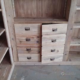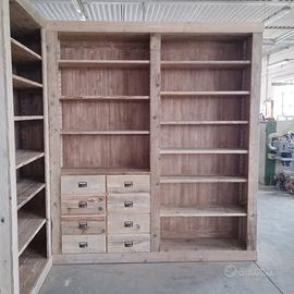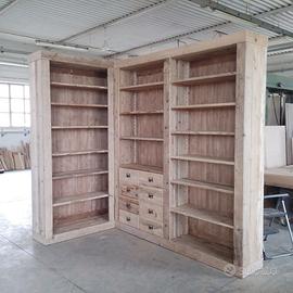 Libreria ad angolo in legno vecchio recuperato assi da muratore sotto tetti/parancole costruita ad angolo con misure lungh. 150 lato angolare mentre lato lungo 2 moduli da 110 cadauno prof.40 h 240. Nella parte frontale il tutto verrà proporzionato in modo che i vani risultino tutti uguali. La predisposizione nel lato angolo con 6 ripiani in legno vecchio aggiustabili tramite cremagliera interna in legno. Sulla parte frontale avremo le spallette sempre in legno vecchio come anche lo zoccolo e il cappello con relativa cornice. Sul ripiano per evitare movimenti nel tempo verrà inserito tramite una fresata un legno duro in modo da mantenerlo dritto nel tempo. Il 2° vano avrà nella parte bassa 6 frontali in legno vecchio applicati sul 2 ante che si apriranno tramite cerniere regolabili da cucina, predisposto all'interno 1 ripiano aggiustabile, il restante sopra con ripiani. 3° modulo con tutti (6) ripiani aggiustabili con scaletta in legno. Schienale del mobile in abete nuovo che poi verrà tintato. Completo di gambette livellatrici nascoste dietro lo zoccolo per mettere a bolla il tutto, manigliette a finestrella pattinata antica. il prezzo si intende franco fabbrica compresi di finitura cerata trasparente neutra iva non comprendente. mobile già realizzato su commissione e venduto, non teniamo magazzino ma essendo i diretti produttori possiamo costruirlo in base alle proprie esigenze e misure che ognuno richiede. per dubbi e chiarimenti contattateci essendo i diretti produttori falegnami costruiamo su misura e specifiche del cliente. ASTENERSI RIVENDITORI E COMMERCIANTI