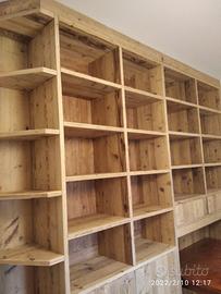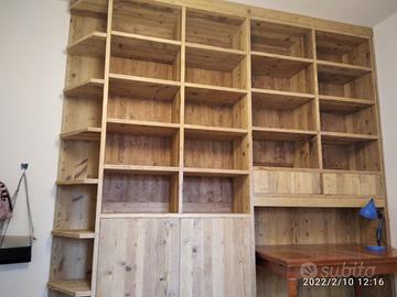libreria armadio costruito a 3 strati (interno multistrato e rivestita ambo i lati con cartelle di massello di abete vecchio recuperato da parancole da muratore assi di solai antichi, levigate carteggiare restaurate e pressate in modo che resti dritto e bilanciato nel tempo) misure lunghezza 300 (SCRIVANIA CLIENTE) prof. 45 H 296 predisposta la libreria partendo da dx con sotto vs scrivania e parte posteriore con schienale autoportante e travetto di rinforzo mentre parte superiore con 2 cassetti su guide h circa 15 cm in cui uno libero e altro con rastrelliera, parte superiore con 3+3 ripiani aggiustabili. Vano centrale in cui troveremo 2 ante parte sotto chiuse con apertura su cerniere push pull e 2 ripiani interno mentre nella parte superiore 2 vani a giorno con disposto 4+4 ripiani aggiustabili. Vano sx appena entrati nella stanza troveremo 6 ripiani a giorno sagomanti con schienale autoportante in abete a 3 strati vecchio con ferramenta idonea per aggiustarli in altezza, zoccolo sotto e zoccolo parte superiore cappello. Finitura cerata neutra su legno vecchio scura su abete nuovo. mobile già realizzato su commissione di conseguenza non teniamo magazzino ma possiamo riprodurlo uguale o modificando in base alle proprie esigenze. iva non comprensiva. per domande o dubbi contattateci P.S. disponibili a dare suggerimenti o chiarimenti in merito, per noi conta dare vita al vostro sogno DIRETTAMENTE DAL PRODUTTORE. ASTENERSI RIVENDITORI E COMMERCIANTI