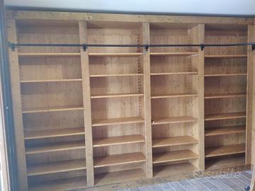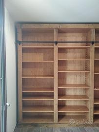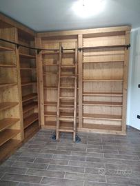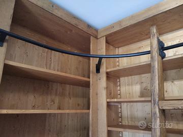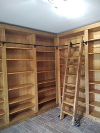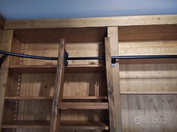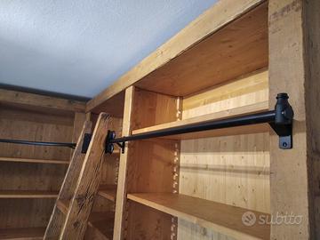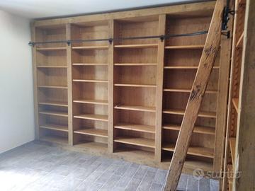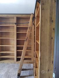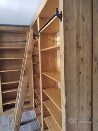 libreria ad angolo costruita in legno di abete VECCHIO PARTI ESTERNE sarebbero tavole recperate da trave parancole da muratore spazzolate e carteggiate che siano morbide al tatto, mentre parte interna in abete nuovo SPAZZOLATO x risaltare la venatura con misure lungh. 403 x 260 prof.40 h 263. Composto in 6 moduli circa uguali e sfruttabile anche nell'angolo con predisposto 6 ripiani per ogni modulo totale ( 36 ripiani ) con spessore da 24 mm in abete nuovo con legno duro inserito alle estremità in modo che non si incurvi nel tempo aggiustabili a mezzo scaletta cremagliera in legno applicata su spalletta frontale in legno vecchio largo 10 cm con pattina in tutti i lati in cui troveremo legno vecchio come pure lo zoccolo h 10 cm e il cappello superiore TUTTO IN PATTINA. come i fianchi esterni laterali a vista in legno vecchio in pattina. Lo schienale posteriore sarà in abete da 14 mm con fascia alle estremità in modo che non si incurvi nel tempo e avvitato posteriormente. Frontalmente avremo all'altezza determinata supporto relativo in ferro applicato direttamente alla spalletta e tubolare continuativo con raggio idoneo per far scorrere la scala, tubolare in ferro verniciato nero opaco e la scaletta (sarà costruita in legno vecchio con pattina in tutti i lati come pure gli scalini circa (7) 210 x 40 larghezza con traversi da 9/10 cm circa con pattina in tutti i lati e aggancio direttamente al tubolare. Piedini livellatori per mettere a bolla il tutto, perni in ferro con relativo barilotto e grano e spine in legno. Finitura lucidata tinta noce medio su abete ed effetto grezzo su legno vecchio nero opaco su ferro. il prezzo NON COMPRENDENTE DI IVA. libreria è già stata prodotta su commissione Non teniamo magazzino ma essendo i diretti produttori possiamo costruirla uguale o su specifiche essendo i diretti produttori. ASTENERSI RIVENDITORI E COMMERCIANTI.