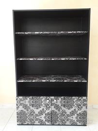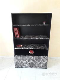 Elegante ed originalissima libreria in legno interamente rivestita a mano in ecopelle nera. Dotata di 3 mensole e 2 sportelli inferiori in rivestimento floreale. L. 100 cm.; h. 165 cm.; p. 40 cm.