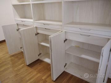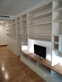 libreria con lunghezza 6,55 h 228 prof. 38+10 corpo avanzato top tv. costruito in listellare ricoperto di frassino spazzolato mentre il top sopra tv in rovere rustico massello stuccato nero. struttura con spessore 3 cm come i ripiani orizzontali lunghi mentre quelli piccoli e corti (porta cd) da 19 mm schienale in multistrato di frassino da 8 mm, ante con maniglia a gola (arrotondata). predisposto modulo da 20 circa a mensole a giorno fisse arrotondate per ingresso stanza. 1°2°3° modulo tutti uguali con lunghezza 80 cm cadauno disposto a terra con piedini incassarti nel fianco, 2 ante h circa 80/90 che si apriranno su cerniere da cucina regolabili ammortizzate in chiusura, interno un ripiano aggiustabile in altezza con ferramenta idonea e un cassetto h circa 15/20 su guide ammortizzate in chiusura. Parte a giorno piccolo tiretto per appoggiare i libri su guide. Parte alta superiore 3 ripiani per tutti i 3 moduli. 4° modulo da 65 cm predisposto solo con 4 ripiani superiori e schienale posteriore fino a terra. 5/6/7° MODULO CORPO AVANZATO di 10 cm TOP IN MASSELLO DI ROVERE (48cm solo per i 4 cassettoni) parte sotto zoccolo terra, 4 cassetti su guide con frontale in frassino con maniglia gola vano a giorno parte superiore per far passare i fili per collegare le casse acustiche poste ai lati. 5° e 7° saranno uguali da 65 cm con varie mensoline piccole verticali e orizzontali e sagomata, 6° modulo da 130 vano tv sotto cassetti schienale autoportante con applicazione led dimerabile duce calda e fredda con telecomando e trasformatore, sopra 4 ripiani aggiustabili. Completo di finitura laccata bianco coprente. costruito su commissione ed esigenze del cliente, non è disponibile a magazzino ma essendo i diretti produttori falegnami possiamo riprodurlo uguale o in base alle proprie esigenze. Iva non comprendente DIRETTAMENTE DAL PRODUTTORE ASTENERSI RIVENDITORI O COMMERCIANTI