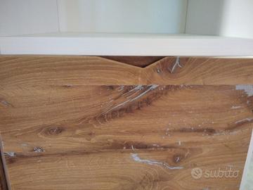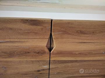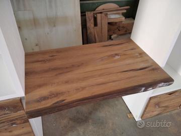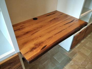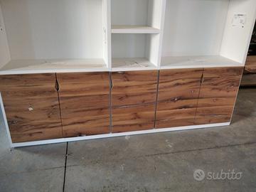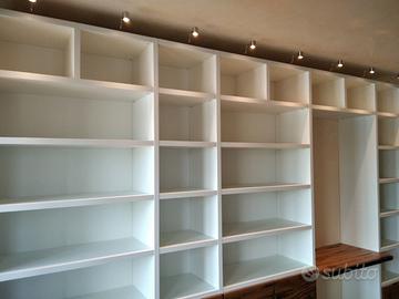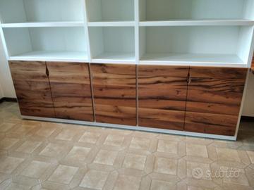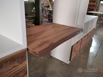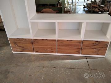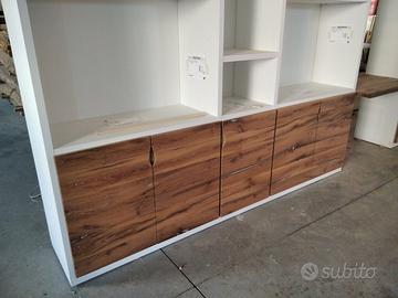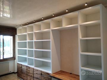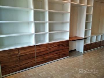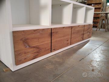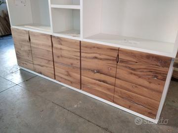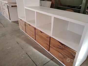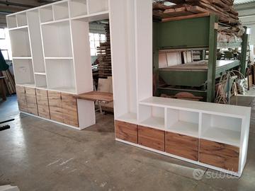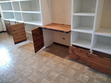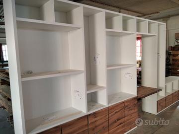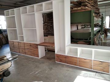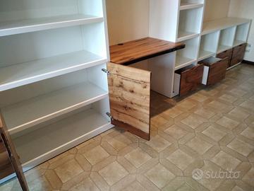 Libreria costruita con fianchi verticali e orizzontali in laminato bianco venato TUTTO CON SPESSORE 35 MM (interno trucciolare riciclato legno abete pioppo) e le ante porte e frontali cassetto e piano scrivania a 3 strati con interno multistrato ed esterno cartelle da 7 mm di rovere vecchio in modo da dare robustezza e non si imbarchi nel tempo, top con piano scortecciato prof. 62 lunghezza 97 circa. misure totali lungh. 602 h 261 prof. 48 compreso frontali in cui troveremo spessore tutto con 3,5 cm a vista in cui la suddivisione composta da 1 modulo da 100 (2 ante "1 rip. interno" sotto ripiani a giorno "3 rip." e 2 vani a giorno superiore. 2 modulo da 50 cm (1 anta "1 rip. interno" sotto 1 anta parte centrale "3 rip." e 1 vano giorno superiore. 3 modulo da 100 (2 ante "1 rip. interno" sotto ripiani a giorno "3 rip." e 2 vani a giorno superiore. 4 modulo da circa 100 a giorno con piano per scrivania in rovere vecchio recuperato scortecciato con 2 vani superiori con schienale solo superiore. 5 modulo da 50 (1 cassettone sotto con vano superiore a giorno. "3 rip" e 1 vano a giorno superiore. 6 7 8 modulo da 50 (1 cassettone sotto con vano giorno). completo di schienale posteriore dappertutto tranne nel vano dove c'è la scrivania, le ante battenti sormonto 8 mm del frontale rispetto allo spessore del fianco verticale con venature orizzontali CONTINUATIVA si apriranno su cerniere da cucina regolabili ammortizzate nascoste e apertura con gola ad apertura a triangolo, supportati da ferramenta a coda di rondine aggiustabili in altezza. Guide ammortizzate in chiusura e interno cassetto laminato bianco liscio SOTTO TROVEREMO piano rialzato zoccolo da 3,5 cm con piedini livellatori per mettere a bolla il tutto e giunzioni con perno barilotto in ferro e spine in legno. finitura oliata su rovere e stucco nero. il mobile è già stato prodotto e venduto su commissione. DIRETTAMENTE DAL PRODUTTORE. ASTENERSI RIVENDITORI E COMMERCIANTI.