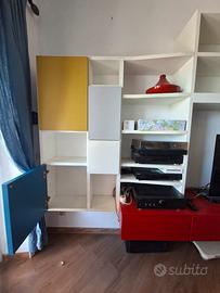 Libreria in legno bianco, si sviluppa su due pareti, con sportelli colorati stile Mondrian. Apertura sportelli a pressione.