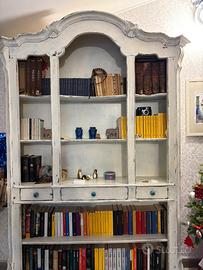 La vetrina libreria combina caratteristiche dello stile provenzale o shabby chic, con una finitura bianca decapata. Richiama nella parte superiore ed inferiore lo stile Luigi Filippo alleggerito dal design bianco decapato.