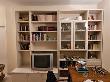 composta da 2 parti di larghezza 150 cm, profondità parte alte 35 cm e parte bassa (cassettiera) 62 cm, altezza complessiva 210 cm circa