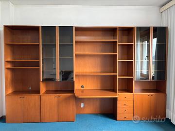 Libreria composta da 5 moduli in legno impiallacciato noce tanganica, finiture noce chiaro, 2 vetrine in vetri fumè. In ottimo stato come da foto. Dimensioni: Lunghezza 370 cm Altezza 224 cm Profondità 42 cm