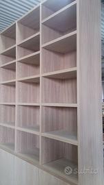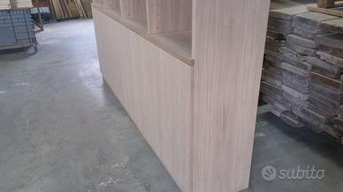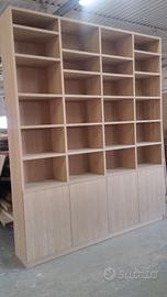 Libreria costruita interamente in listellare ricoperto di rovere e completamente smontabile con misure lunga 240 con altezza 290 cm profondità 40 cm. composta da 5 ripiani per ogni modulo aggiustabili da spessore 3 cm. completamente smontabile tramite perni barilotti spine in legno. I ripiani saranno supportati da bussola inserita nel legno dove sarà avvitato il supporto maschio con vite e la femmina nel ripiano in modo da fare corpo unico una volta dentro (aggiustabili in altezza). Lo schienale racchiuso nella struttura della libreria autoportante in multistrato da 1 cm di rovere. i 4 vani tutti uguali da 60 cm circa con 4 porte con h 80 e 1 ripiani interno aggiustabile. Le porte sono costruite in pannello di listellare rovere che poi verrà tutto spazzolato. Apertura e chiusura delle ante con cerniere da cucina regolabili per poter usare il push a pressione per apertura. Gambette regolabili dietro lo zoccolo (h 8cm.) che nasconderà il tutto e servono per mettere a bolla. porte e schienale con finitura laccata rall 9010 mentre il restante con effetto naturale grezzo completa nel prezzo franco fabbrica con imballo iva da calcolare a parte. il mobile è già stato prodotto su commissione del cliente ma possiamo riprodurlo uguale o con misure diverse dato che siamo i diretti produttori falegnami. per noi conta dare vita alla vostra idea. DIRETTAMENTE DAL PRODUTTORE. ASTENERSI RIVENDITORI E COMMERCIANTI
